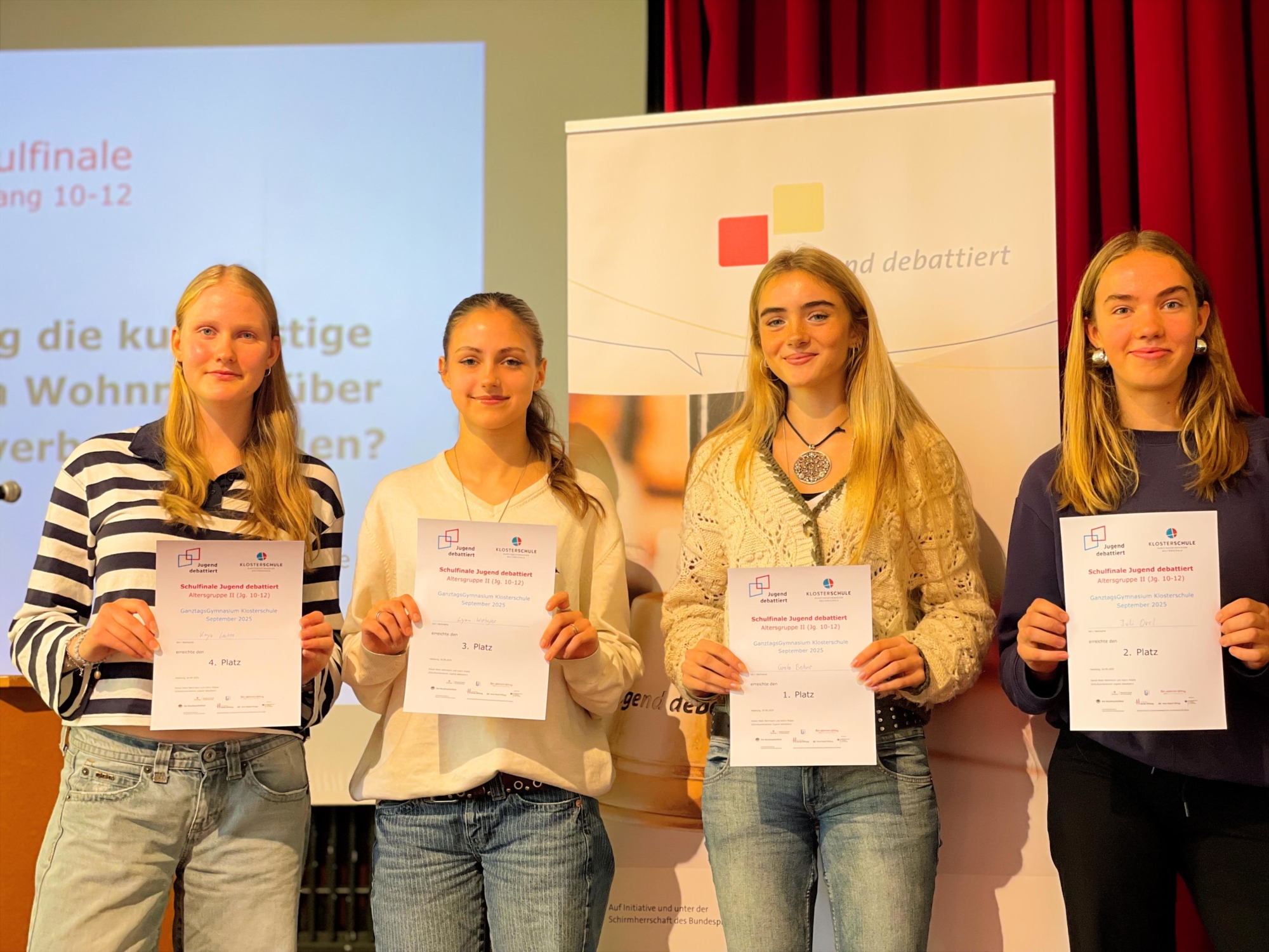 Soll in Hamburg die kurzfristige Vermietung von Wohnraum über Online-Plattformen verboten werden? – Zu dieser Frage debattierten am Mittwoch, den 24. September Greta Bohne , Kaya Lochte (beide Jg. 11, Geographie-Englisch-Profil), Juli Ovel (Jg. 12, Geographie-Englisch-Profil) und Lynn Wiebigke (Jg. 11, Geschichte-Theater-Profil) im Schulfinale des Wettbewerbs Jugend debattiert. Sie hatten sich eine Woche zuvor in den Qualifikationsrunden, an denen 8 Schüler:innen aus den Jahrgängen 10 bis 12 teilgenommen hatten, fürs Finale qualifiziert.